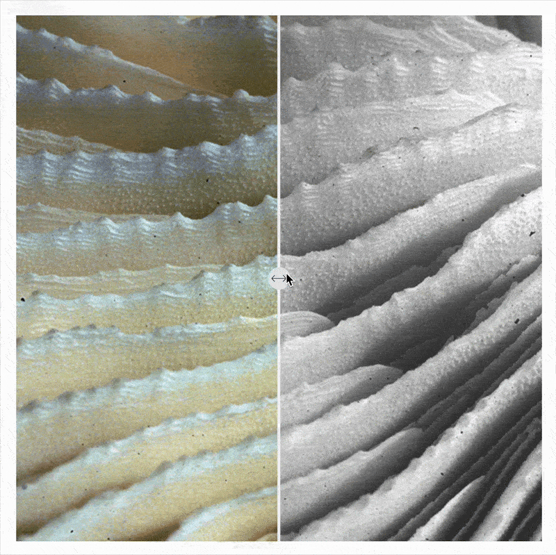 Clicking on an image allows for a deeper exploration of that coral genera. The interactive slider, allowing users to transition between colored and monochrome images, creates a dramatic visual impact intended to inspire environmental action.